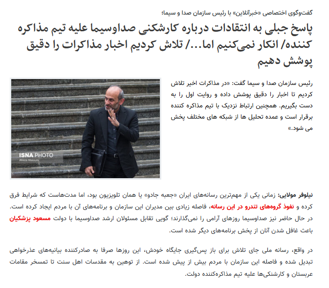 والجدير بالذكر أن جبلي رد على الانتقادات الموجهة لأداء الإعلام الوطني في تغطيته لمفاوضات إيران وأمريكا قائلا: “يدعم الإعلام الوطني الحكومة في السياسات والاستراتيجيات الوطنية الكبرى”.