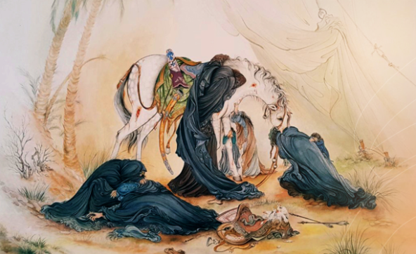 تجسد اللوحة حصان الإمام الحسين، الخالي من راكبه، عائدا إلى الخيام، محمّلا بدلالات الفقد والوفاء. بخطوطها المنحنية وألوانها القاتمة، وشخصياتها الغارقة في الحزن، تخلق أجواء تجمع بين الروحانية والبعد التراجيدي. وقد أُهدي هذا العمل إلى متحف العتبة الرضوية في مشهد، ليصبح رمزا لفن التصوير الشيعي، مؤثرا في قلوب ملايين الزائرين إلى مشهد.