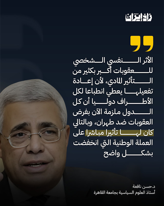 وعن مدى تأثير العقوبات الأممية على الوضع في إيران، أشار د. نافعة إلى أن الأثر النفسي في تقديره الشخصي أكبر بكثير من التأثير المادي، لأن إعادة تفعيل العقوبات يعطي انطباعا لكل الأطراف على المسرح الدولي أن كل الدول ملزمة الآن بفرض العقوبات ضد إيران، وبالتالي كان لها تأثير مباشر على العملة الإيرانية التي انخفضت بشكل واضح وملموس خلال اليومين الماضيين، وبالتالي لا يجب التقليل من تأثير هذه العقوبات على الوضع الاقتصادي الإيراني، وهو ما تأخذه إيران في عين الاعتبار.