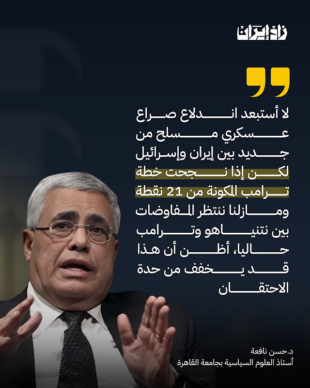 كما ستحاول طهران، وفقا للدكتور حسن نافعة، استخدام كل ما في جعبتها من علاقات استراتيجية بالصين وروسيا وكوريا الشمالية، بالإضافة إلى العلاقات الإقليمية وقدرتها الذاتية، وهي تستعد الآن، ولا تستبعد أن تكون هناك مرحلة عسكرية، ربما لا أستبعد ذلك بأن تكون هناك جولة عسكرية أخرى، لكن كل هذه الأمور مترابطة مع بعضها، وليس بالضرورة أن تحدث المواجهة العسكرية، لكنها ليست مستبعدة على الإطلاق.