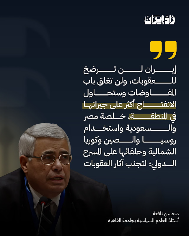 أوضح د. نافعة، في تقديره، أن إيران لن ترضخ، لكنها لن تغلق باب المفاوضات، وبالتالي ستحاول استخدام روسيا والصين وكوريا الشمالية وحلفائها على المسرح الدولي؛ أولا لتجنب آثار العقوبات حتى لا يكون تأثيرها خطيرا لا تستطيع أن تتحمله، كما ستحاول الانفتاح أكثر على الأطراف الإقليمية، وبالذات على السعودية ومصر التي بدأت علاقتها بها تتحسن إلى حد كبير، وأيضا قطر وسلطنة عمان إلى آخره، ستتقرب طهران منهم أكثر، تحاول إعادة ترتيب علاقتها مع الأطراف الإقليمية على الأقل، لكي لا تترك ثغرة تحاول منها الولايات المتحدة وإسرائيل استغلال سوء العلاقات مع جيرانها في المنطقة كما كان الوضع سابقا.