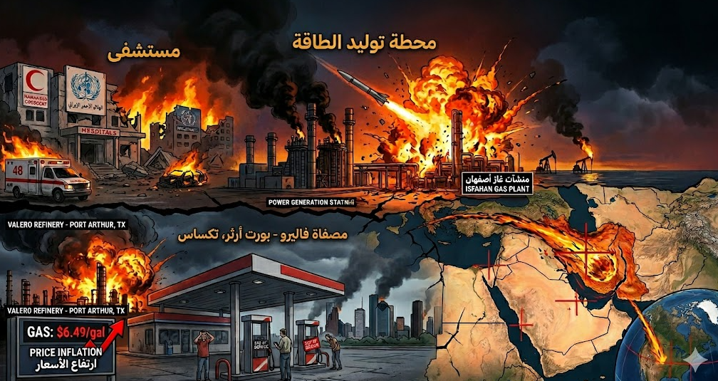لم تعد الحرب الدائرة بين إيران من جهة والولايات المتحدة وإسرائيل من جهة أخرى مجرد جولة أخرى من الصراع، بل هي إعادة رسم لخارطة القوى في الشرق الأوسط بالدماء والنار. لقد أثبتت الوقائع الميدانية أن سياسة استهداف البنى التحتية هي سلاح ذو حدين؛ فبينما تحاول واشنطن وتل أبيب خنق طهران داخليا، ترد الأخيرة بنقل المعركة إلى جيوب المواطن الأمريكي وسوق الطاقة العالمي.
